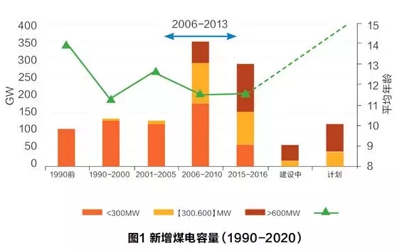 可以預(yù)見,在市場環(huán)境下,這些大機組將是“虧錢”(missing-money)的那部分機組,生不逢時,屬于不折不扣的“落后產(chǎn)能”。那么,這部分產(chǎn)能有多大呢?卓爾德Draworld研究中心對過去與今后5年預(yù)期的煤電增長,根據(jù)容量大小做了可視化的工作(圖1)。從2006年算起,到2016年的這十年,超過60萬千瓦的新建超臨界機組超過1.5億以上。整體煤電機組的平均年齡11-12歲。