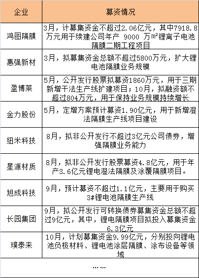 另一方面,已上市的隔膜公司幾乎都進行了不同程度的募資,用于強化隔膜業(yè)務(wù),募資金額以億元規(guī)模為主。