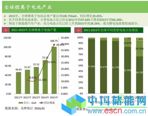 鋰電池材料下游需求主要在小型電池(消費電子)、動力電池(新能源汽車)、儲能等領(lǐng)域。根據(jù)統(tǒng)計,2015年全球鋰離子電池總產(chǎn)量達到了100.75Gwh,其中小型電池占比66.28%、動力電池占比28.26%、儲能電池占比5.46%,動力電池領(lǐng)域的占比對比2014年增長接近一倍: