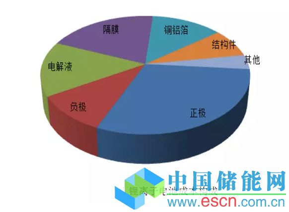 鋰離子電池的主要組成部分包括正極、負極、電解液和隔膜等,統(tǒng)稱為鋰電池四大材料,上述材料在電池成本中所占的比例不同。其中,正極材料占40%左右,電解液占16%左右,隔膜占21%左右,負極材料僅占5%。因此,可以說正極材料的成本直接決定鋰電池成本的高低。