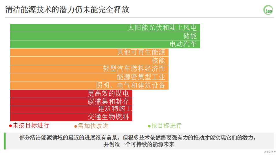 《能源技術(shù)展望2017》還包括了國際能源署年度清潔能源進度報告,顯示當前技術(shù)發(fā)展和部署只處于次優(yōu)狀態(tài)。今年研發(fā)的特別部分表明,政策在技術(shù)創(chuàng)新價值方面提供了明確的信號,進步已經(jīng)很大,但許多技術(shù)領(lǐng)域依舊缺乏政治支持。