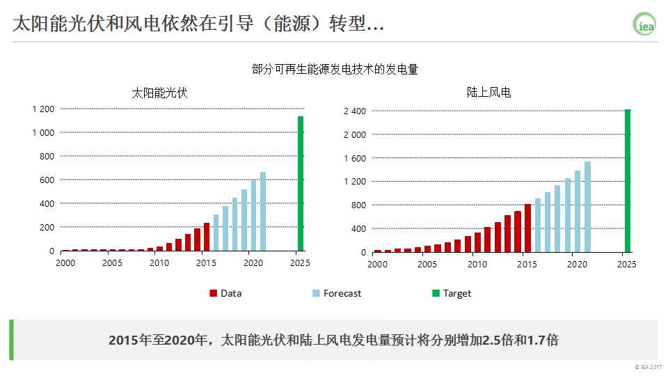 把這些趨勢進一步延伸至2025年,國際能源署認為我們正處于實現(xiàn)2DS情景目標的軌跡上,這在發(fā)電量上可以得到體現(xiàn)。