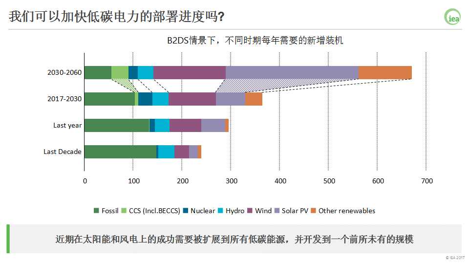 在2DS和B2DS情景中,需要低碳電力技術(shù)的快速發(fā)展,而且大部分技術(shù)需要的增速是前所未有的。