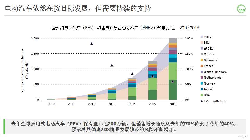 雖然增速從2015年的70%降到2016年的40%,但電動汽車依然處于實現(xiàn)2DS 情景2025年目標的軌跡上,但(增速的降低)對實現(xiàn) 2DS情景在2020年的中期目標產(chǎn)生威脅,并有可能進一步影響2025年目標的實現(xiàn)。