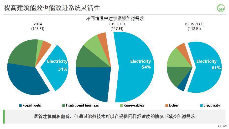 在B2DS情景, 通過轉(zhuǎn)向高效、低碳的技術(shù)不僅可以帶來更低的能源需求,還可以在使用比RTS情景更少的電力的情況下實現(xiàn)更高水平的建筑電氣化。