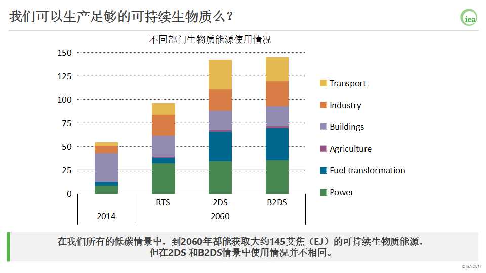 在2DS和B2DS情景中模擬生物質(zhì)能源的角色時,考慮到能持續(xù)獲取的生物質(zhì)原料數(shù)量的限制,總的可獲取的生物質(zhì)供應(yīng)被限定在145 EJ。