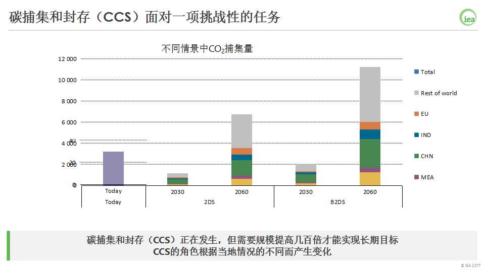 在2DS情景中,CCS在減少電力、工業(yè)和交通領(lǐng)域的碳排放中作用巨大。在2060年,每年將有大約70億噸的CO2被捕集。這與目前每年3000萬噸的捕集量相比,是一個巨大的增長。B2DS情景則更加依賴CCS,2060年需要每年捕集超過110億噸CO2。