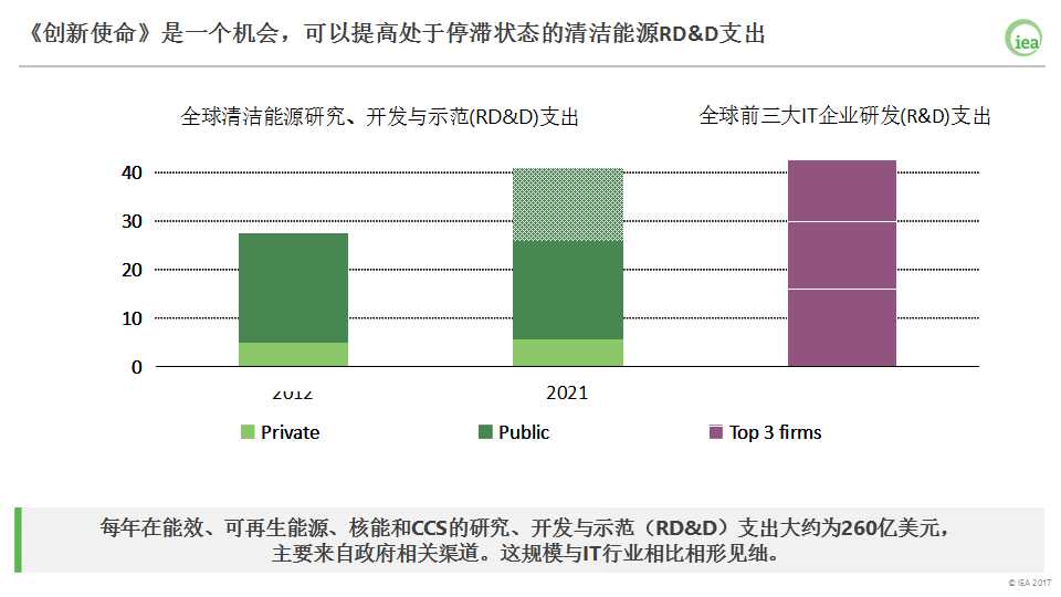 2015年,清潔能源領(lǐng)域研究、開發(fā)和示范RD&D的投資是260億美元。公共部門支出占78%,這其中包括了國企的支出。