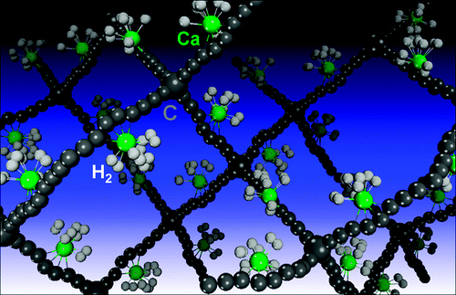加上鈣就不是這樣。它使晶格在吸收氫時,鍵能(binding energy)會有利于有效的室溫可逆儲存。由于鈣原子不成串,它們的分布就會沿著碳炔鏈進行,就像葡萄結(jié)在藤蔓上,而且每個鈣原子會結(jié)合多達6個氫原子;這會賦予這一網(wǎng)絡(luò)一種潛在的存儲容量,大約相當于8%的自身重量。