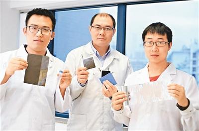 香港城市大學副教授支春義(中)帶領李洪飛(左)、唐子杰(右)等博士生研究出一種水系鋅電池。圖為三人分別手持封裝后的鋅電池以及用來制造兩個電極的二氧化錳材料和鋅片。