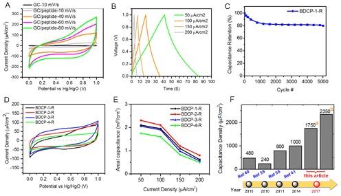 在此基礎上,研究人員進一步研究了組裝材料的光學和電學性質。在不同激發(fā)光照射下,多肽組裝體可以發(fā)出從藍色到紅色熒光。該材料在生物成像領域存在巨大的應用前景。在電學測試中,在李舟指導下,研究人員探討了多肽組裝體作為超級電容器活性材料的儲能性質。2009年,來自以色列的科學家首次報道了環(huán)狀苯丙氨酸二肽“納米森林”材料在儲能方面的應用。該研究顯示了多肽材料具有良好的力學、電學性質,結合多肽納米材料較高的比表面積、合適的親疏水性,以及優(yōu)良的導電性質等優(yōu)點,多肽儲能成為了下一代柔性、可植入、輕質、無污染儲能器件的潛在選項。在該研究中,研究者系統(tǒng)比較了四組多肽分子的電化學性質,結果表明多肽材料儲能大小可以通過多肽序列來調(diào)控。通過循環(huán)伏安法、恒流充放電等電化學測量手段,證明多肽材料具有良好的循環(huán)穩(wěn)定性、倍率性以及高于FF多肽材料的比電容性質。