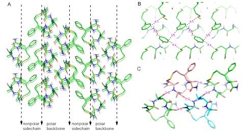接下來他們對多肽自組裝的機理進行了研究。通過與北京大學深圳研究生院兩個課題組的合作,對多肽組裝結構進行了晶型預測,得到了多肽分子的組裝模型。該模型顯示出了和實驗結果良好的一致性。結果表明,多肽分子間的π-π相互作用,S-π 相互作用,以及氫鍵網(wǎng)絡驅動了多肽分子的組裝。在多肽組裝體中,極性和非極性界面依次形成,且每兩個極性層的偶極子方向相反,這樣使組裝體內(nèi)部的偶極相互作用得以相互抵消,進一步穩(wěn)定了組裝體。這也是該領域首次報道S-π 相互作用參與多肽自組裝的例子。
