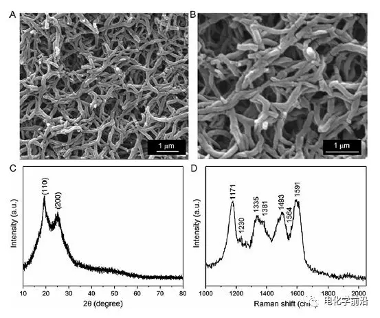 (a-b):不同放大倍數(shù)下聚苯胺正極材料SEM圖