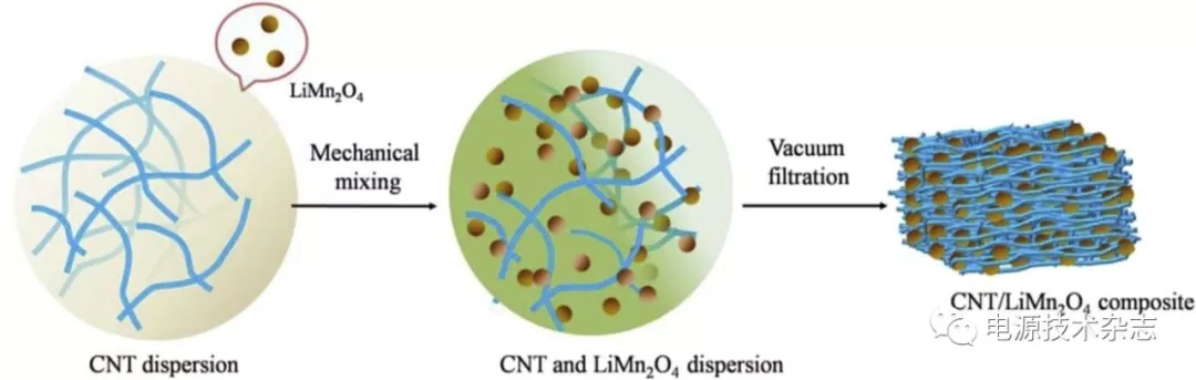 圖4 無(wú)粘結(jié)劑的LiMn2O4-碳納米管復(fù)合電極的制備