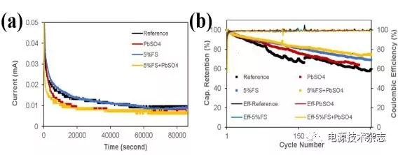 在進(jìn)一步研究中,Tuan等發(fā)現(xiàn)在溶膠電解液中加入微量Pb2+可以進(jìn)一步提高電池性能,并且發(fā)現(xiàn)二氧化硅和Pb2+都有作為電腐蝕抑制劑的作用。11如圖6所示,在溶膠電解液中加入Pb2+可以進(jìn)一步降低浮充電流并且提高循環(huán)性。而且由實(shí)驗(yàn)可知,5%的硅溶膠加入微量Pb2+后得到的循環(huán)性能最為優(yōu)秀,達(dá)到了74.4%的容量保持率,而對(duì)照組僅為59%。