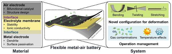 中國(guó)儲(chǔ)能網(wǎng)訊:隨著柔性和可穿戴電子設(shè)備的發(fā)展,柔性儲(chǔ)能器件吸引了科研界及工業(yè)界的廣泛關(guān)注。近年來(lái),圍繞柔性鋰離子電池和超級(jí)電容器開(kāi)展了一系列工作,并且取得了重要進(jìn)展。然而,為了延長(zhǎng)電子設(shè)備的續(xù)航時(shí)間,需要儲(chǔ)能系統(tǒng)有著更高的能量密度??裳h(huán)充放電的金屬空氣電池由于其遠(yuǎn)高于目前鋰離子電池的理論能量密度,被認(rèn)為是將來(lái)最具有前景的儲(chǔ)能裝置。開(kāi)發(fā)柔性金屬空氣電池?zé)o疑將極大提高柔性和可穿戴電子設(shè)備的續(xù)航能力,但是也需要解決更多的挑戰(zhàn)。一方面,電池的能量密度、能量效率以及循環(huán)壽命都需要提高;另一方面,電極結(jié)構(gòu)、電解液材料以及電池構(gòu)造都需要進(jìn)行優(yōu)化,以在形變條件下保持穩(wěn)定的電化學(xué)性能。