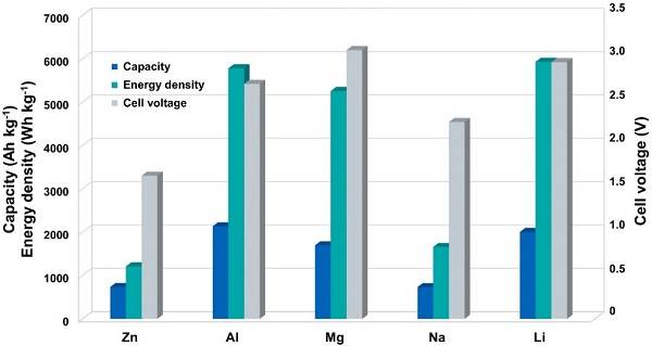 圖1 不同金屬空氣電池的容量、能量密度和電壓對(duì)比