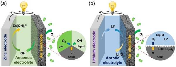 圖2 堿性體系鋅空氣電池和非水體系鋰空氣電池的工作原理示意圖
