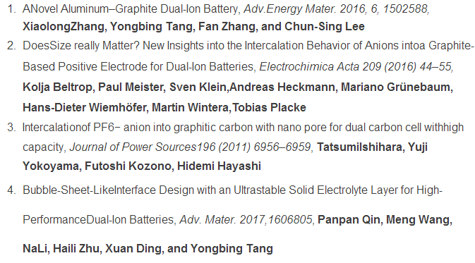 儲能領(lǐng)域從來都不缺乏攪局者,最近幾年新興的雙離子電池就是其中之一。與鋰離子電池的正負極之間只有Li+在參加反應(yīng)不同,雙離子電池的充電的過程中,陰離子在電場的作用下向陽極遷移,嵌入到陽極結(jié)構(gòu)之中,陽離子向陰極遷移,嵌入到陰極之中,放電的過程則與之相反,陽極和陰極中的離子脫出,回到電解液中,恢復(fù)電解液的濃度。目前雙離子電池使用的正極材料主要是石墨材料,其實陰離子能夠嵌入到石墨結(jié)構(gòu)中早在1938就由Ru?dorff和Hofmann發(fā)現(xiàn),但是由于陰離子的嵌入電勢較高,因此早期的雙離子電池的電解液使用高濃度的酸溶液作為電解液,這會帶來很大的安全隱患。直到90年代,隨著鋰離子電池的商業(yè)化應(yīng)用,人們發(fā)現(xiàn)如果將鋰離子電池的正極替換為能夠嵌入陰離子的石墨類材料,可以獲得較高電壓的雙離子電池。隨后的幾十年人們開始對雙離子電池展開了深入的研究,特別是對陰離子嵌入到石墨結(jié)構(gòu)中的機理進行了深入的研究「1」。
