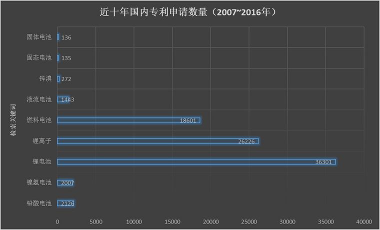 鋰電池?zé)o可厚非的是當(dāng)下最時(shí)髦的電池技術(shù),在消費(fèi)級(jí)市場(chǎng),動(dòng)力電池和儲(chǔ)能領(lǐng)域,都被寄予著厚望。所以當(dāng)我以鋰離子或鋰電池為檢索關(guān)鍵詞的時(shí)候,檢索出的專利數(shù)量都在2萬(wàn)件以上。相應(yīng)的,像燃料電池這樣即將呼之欲出的技術(shù),近十年的專利技術(shù),也接近了2萬(wàn)件。而向鉛酸電池、鎳氫電池這樣的成熟電池技術(shù),專利數(shù)則在2千件左右。固態(tài)電池相關(guān)技術(shù),專利數(shù)只有一兩百件,說(shuō)明這個(gè)技術(shù)普遍在行業(yè)內(nèi)認(rèn)知程度還不高。