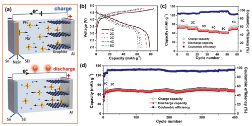 結合鈉離子與雙離子電池的綜合優(yōu)點,唐永炳及其團隊成員圣茂華、張帆、季必發(fā)等人成功研發(fā)出一種全新的基于鈉離子電解液的新型高性能、低成本錫-石墨雙離子電池。該電池直接采用錫箔同時作為電池負極和集流體,石墨作為正極;電解液采用廉價易得的六氟磷酸鈉作為鈉鹽電解質溶于有機溶劑中。該新型電池具有超出預期的能量密度和較長的循環(huán)壽命,并且大幅降低了電池的生產成本。該新型電池的反應機理為:充電時,電解液中的鈉離子運動到錫箔負極表面,形成鈉錫合金,同時六氟磷酸根插層到正極石墨中;放電時,負極上的鈉錫合金脫鈉,同時正極石墨中的六氟磷酸根脫嵌回到電解液中。研究結果表明,該新型鈉離子雙離子電池在2C倍率下充放電循環(huán)400圈后,仍保持94%的容量;且能量密度可達到144Wh/kg,高于現(xiàn)有傳統(tǒng)鋰離子電池能量密度。該研究成果具有巨大的產業(yè)化前景,并有望代替現(xiàn)有傳統(tǒng)鋰離子電池技術。