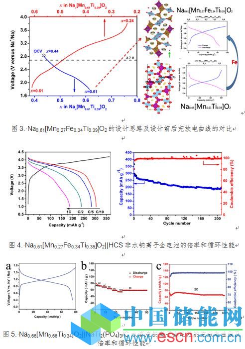 在認(rèn)識了隧道結(jié)構(gòu)中各個過渡金屬的占位和價態(tài)以及電荷補償機制的基礎(chǔ)上,博士生徐淑銀和胡勇勝研究員等提出了一種正極材料設(shè)計方法(如圖3所示),將具有高電位的Fe4+/Fe3+氧化還原電對引入到Ti取代的樣品的放電態(tài)Na0.61[Mn0.61Ti0.39]O2中,設(shè)計出了空氣中穩(wěn)定、具有高鈉含量、基于Fe的隧道型氧化物正極材料Na0.61[Mn0.27Fe0.34Ti0.39]O2。谷林研究員通過高分辨球差校正電鏡確定了該材料中的各原子占位及其充放電過程中結(jié)構(gòu)的變化。該正極材料在2.5-4.2 V電壓范圍內(nèi),其首周可逆容量可達(dá)90 mAh/g,同時表現(xiàn)出了較高的放電電壓(3.56 V);磁學(xué)國家重點實驗室M04組楊海濤副研究員及成昭華研究員采用穆斯堡爾譜證實了充放電過程中Fe4+/Fe3+氧化還原電對參與電化學(xué)反應(yīng),這是首次在隧道型氧化物中實現(xiàn)Fe4+/Fe3+氧化還原電對的可逆轉(zhuǎn)變。使用該正極和硬碳負(fù)極組裝的非水鈉離子全電池的能量密度可達(dá)224 Wh/kg(根據(jù)正負(fù)極質(zhì)量之和計算得到),顯示了較好的倍率及循環(huán)性能(圖4)。更為重要的是,該材料中所使用的元素Na、Fe、Mn、Ti均在地殼中含量豐富、環(huán)境友好,適合發(fā)展大規(guī)模儲能用鈉離子電池。