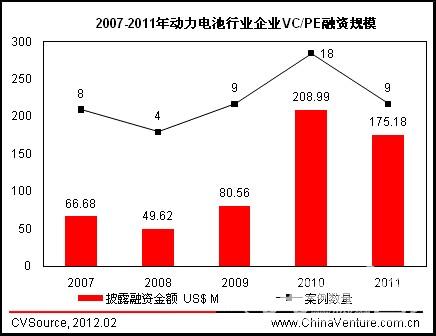 圖1 2007-2011年動力電池行業(yè)企業(yè)VC/PE融資規(guī)?! ?/div>