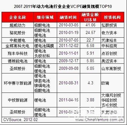 表2 2007-2011年動力電池行業(yè)企業(yè)VC/PE融資規(guī)模TOP10