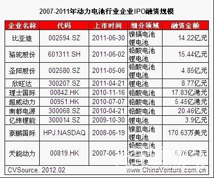 表3 2007-2011年動力電池行業(yè)企業(yè)IPO融資規(guī)?! ?/div>
