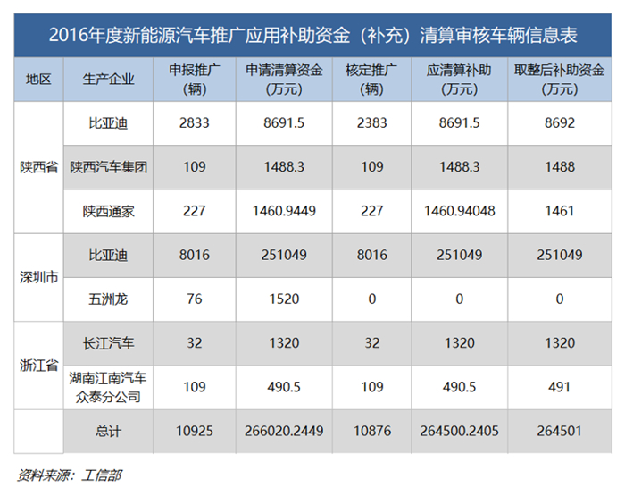 2016年度,三省市企業(yè)共申報新能源汽車推廣數(shù)量為10952輛,申請清算資金266020.2449萬元,最后核定推廣10876輛,應(yīng)補貼金額為264500.2405萬元。值得注意的是,當年度只有深圳五洲龍汽車公司申請的76輛客車因未進入當年推薦車型目錄,因此申請的1520萬元國補全部被取消。