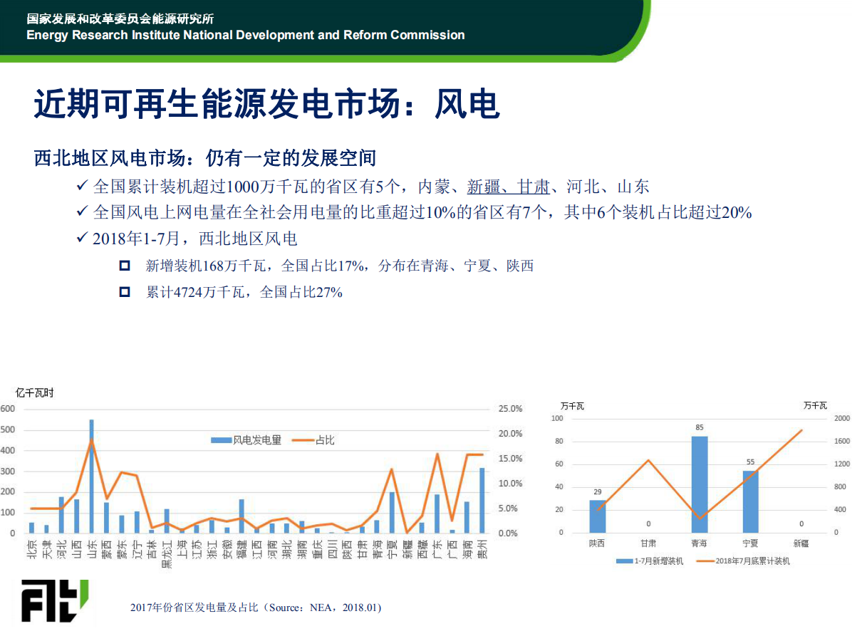從2017年開始,國家對于棄風(fēng)棄光的問題采取了很多的政策以及相應(yīng)的有效措施,主要包括貫徹落實可再生能源發(fā)電的全國保障性的收購制度,建立風(fēng)光的預(yù)警和評價機制。挖掘電力系統(tǒng)調(diào)峰,建立輔助服務(wù)市場,去年無論是棄風(fēng)還是棄光的范圍得到控制,電量和比例都實現(xiàn)了雙降低的成果。當(dāng)然有個別地區(qū),比如西北的新疆和甘肅,棄風(fēng)的比例像今年一41到8月份,新疆超過了20%,甘肅是接近20%,這個數(shù)字是相對比較高的。