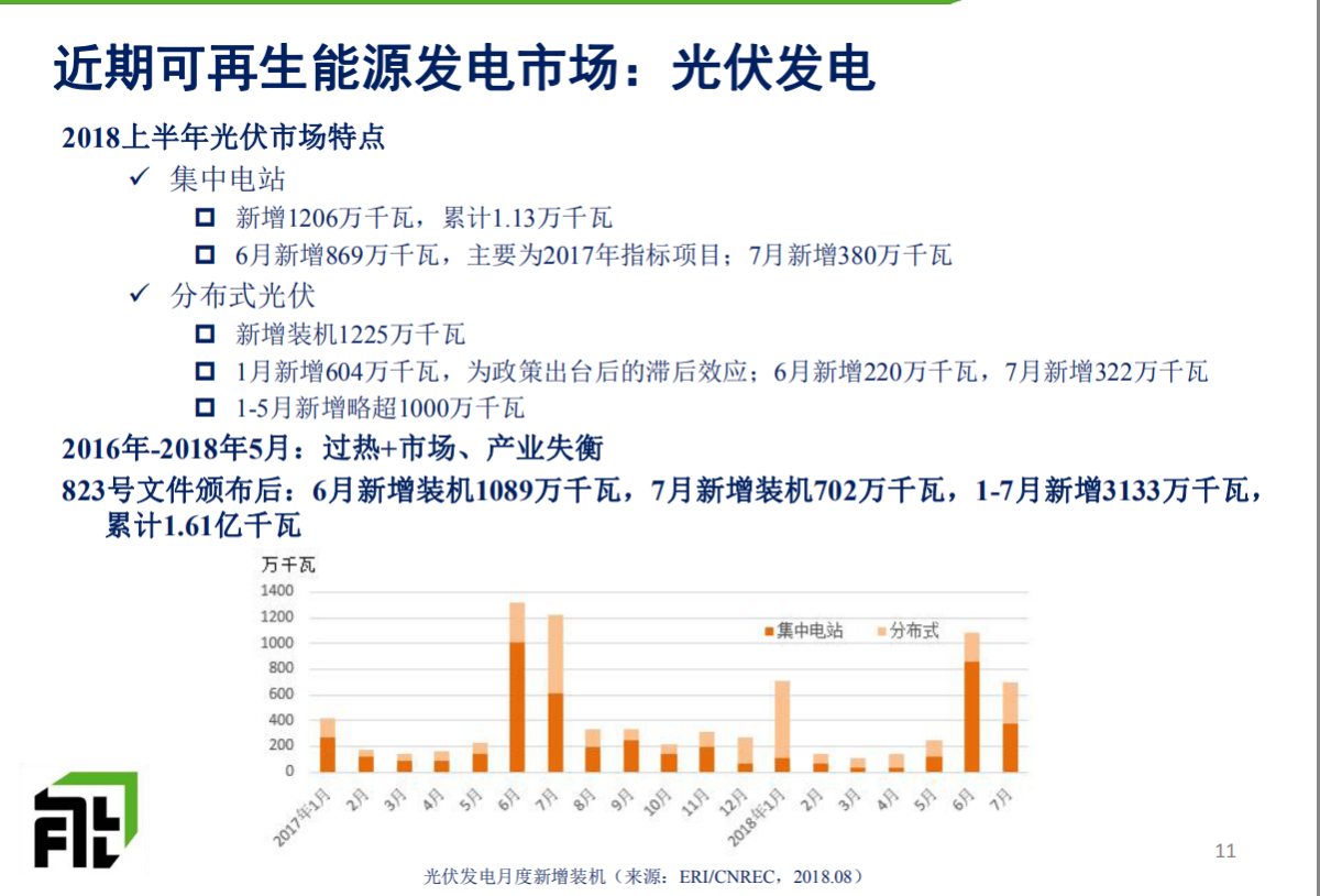 國內(nèi)的光伏發(fā)電市場呈現(xiàn)了持續(xù)快速增長的形勢,2016年新增裝機3400千瓦,2017年新增裝機5306萬千瓦。國家出臺了文件,對于需要國家補貼的建設(shè)規(guī)模加以適度引導(dǎo)和控制,盡管這樣新增裝機仍然是非常大的數(shù)字,接近了50%的水平。上半年光伏發(fā)電新增裝機超過了2400萬千瓦,這個數(shù)字和去年同期相比基本持平,累計裝機超過了1.5億千瓦,發(fā)電量占比達到了2.6%。上半年國家的光伏發(fā)電市場分布特點是集中式的光伏發(fā)電電戰(zhàn)基本上占據(jù)了50%,各占50%,超過了20萬千瓦的水平。一直到823號文件出臺,光伏發(fā)電市場以及產(chǎn)業(yè)出現(xiàn)了一些局部的過熱以及產(chǎn)業(yè)失衡的局面。為了引導(dǎo)產(chǎn)業(yè)的健康發(fā)展出臺了823號文件。盡管如此在823號文件之后,政策出臺還是有滯后的效應(yīng),頒布以后6月份的新增裝機有一個搶政策,當(dāng)月還是超過了1089萬千瓦,7月新增裝機超過了702萬千瓦,使我們目前的累計裝機超過了1.61億千瓦的水平。