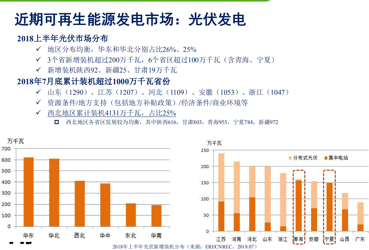 從新增裝機的地區(qū)分布來看,上半年光伏發(fā)電的地區(qū)分布比較均衡,華東和華北分別各占四分之一,全國有五個省份累計裝機超過了1000萬千瓦,西北地區(qū)累計裝機超過了,五個省區(qū)超過了4000萬千瓦,但發(fā)展比較均衡,除了陜西以外幾乎都是接近1000萬千瓦的水平??偟恼急任鞅辈畈欢嗾剂怂姆种弧?、聯(lián)合或耦合互補發(fā)電是其優(yōu)勢,尚需要在產(chǎn)業(yè)鏈建設(shè)、電站規(guī)模化、降低成本方面要持續(xù)推進。光熱發(fā)電的起步和成長階段比風(fēng)電和光伏分別晚10年到5年的時間,所以需要在產(chǎn)業(yè)鏈的建設(shè)、規(guī)模化、降成本方面持續(xù)的推進。目前我們在青海德令哈和甘肅敦煌一期各一萬千瓦的電站,國家首批示范項目20個,今年年初其中有4個選擇退出,還剩16個首批光熱示范項目,總裝機能夠超過100萬千瓦,預(yù)計今年年底有望投運達到4個和5個,青海項目進展是相對比較快的。