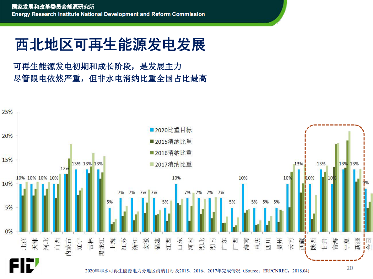 近期首要解決西北地區(qū)可再生能源消納問題,后期才會有一定的發(fā)展空間。從今年的情況上來看,風(fēng)電的監(jiān)測預(yù)警2018年發(fā)布的結(jié)果,新疆、甘肅仍是紅色預(yù)警區(qū),尤其是寧夏從2016年的紅色直接減為綠色,還是有很大的顯著變化。光伏發(fā)電今年上半年的市場監(jiān)測評價結(jié)果,新疆、隴西是紅色,所以解決消納問題是首要的任務(wù)。提升可再生能源能源在西北地區(qū)的利用性是非常重要的,西北地區(qū)風(fēng)光資源豐富,我們不考慮棄風(fēng)棄光限量的情況下,其他地區(qū)煤電價格比較低,在推進市場化的方面,風(fēng)光需要跟非常便宜的電力相比,這樣可能對于實現(xiàn)平價上網(wǎng),在西北地區(qū)雖然有天然的太陽能和風(fēng)能的資源優(yōu)勢,但挑戰(zhàn)仍然還是非常大的。我們對2020年的補貼做的需求分析,可以看出西北地區(qū)仍然是高于全國的平均水平,高于大部分地區(qū)的水平。