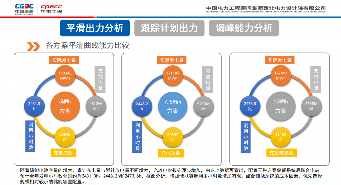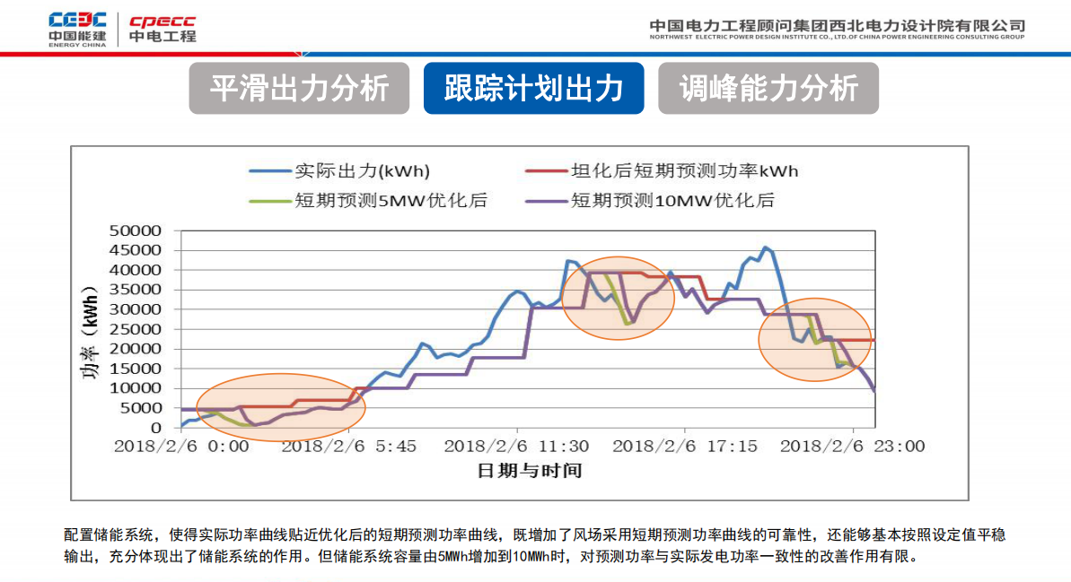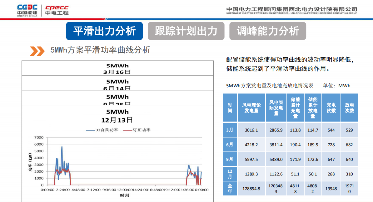 我們選取的是風電場一期的資源以及實際的運行數據進行分析,配置了三個儲能方案,為了更直觀的顯示儲能電池對電站功率輸出的平滑作用,分別選取了四個典型日的數據進行分析。藍色曲線是風功率曲線,紅色曲線是平滑出力波動以后的狀態(tài),從這些數據我們另外統(tǒng)計了全年的儲能電站的運行情況,根據圖表我們可以看出儲能系統(tǒng)的配置,起到了很好的作用,對全年的數據應用進行統(tǒng)計,大概是4800兆瓦時,充放電次數是19700到19900多次。平滑出力分析,我們選取了5兆瓦時和7.5兆瓦時的兩個數據進行比較,當儲能系統(tǒng)容易增加,使得功率曲線的波動率更明顯的降低。儲能能量增加的時候,我們優(yōu)先選擇了相對規(guī)模較小的配置方案。此外,我們對電池儲能系統(tǒng)跟蹤計劃出力能力進行了分析,因為很難準確預測它的功率曲線,我們根據2018年同期的實際發(fā)電數據進行比較分析,考慮把短期功率預測曲線進行優(yōu)化,藍色曲線是實際的發(fā)電功率曲線,紅色曲線是對功率預測曲線進行了優(yōu)化,綠化是配置了5兆瓦時儲能系統(tǒng)后的功率預測曲線,配置了儲能系統(tǒng)以后,能夠基本按照設定的值平穩(wěn)輸出,充分體現了儲能系統(tǒng)的作用,由圖中橙色區(qū)域可以看出,儲能增加的時候不足以帶來解決成本的問題,所以對儲能預測與實際功率一致性的改善作用是有限的。