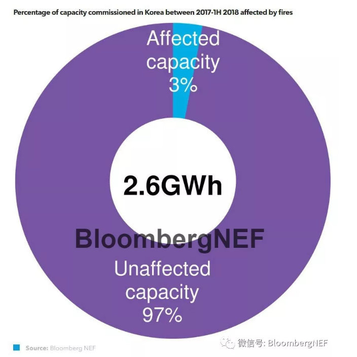 在韓國(guó)2017年及2018年上半年所投運(yùn)的鋰離子電池儲(chǔ)能項(xiàng)目中,起火事故所波及的項(xiàng)目容量占到了3%