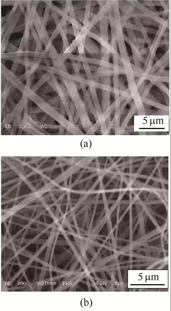 湘潭大學(xué)肖啟珍等(2012)用靜電紡絲法制備了PET納米纖維隔膜,制造出的納米纖維隔膜具有三維多孔網(wǎng)狀結(jié)構(gòu),如(b)圖,纖維平均直徑300nm,且表面光滑。