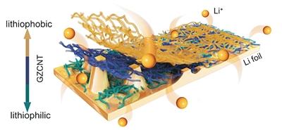 論文第一作者張慧敏介紹,團(tuán)隊(duì)巧妙設(shè)計(jì)出擁有親鋰憎鋰“雙重性格”的梯度金屬鋰保護(hù)膜,底部是具有親鋰性能的納米氧化鋅/碳納米管復(fù)合層,頂部是憎鋰強(qiáng)度高達(dá)8GPa的碳納米管層。該保護(hù)膜可以長(zhǎng)期有效抑制鋰枝晶生長(zhǎng),確保電池獲得極高安全性,以及接近100%的充放電效率。