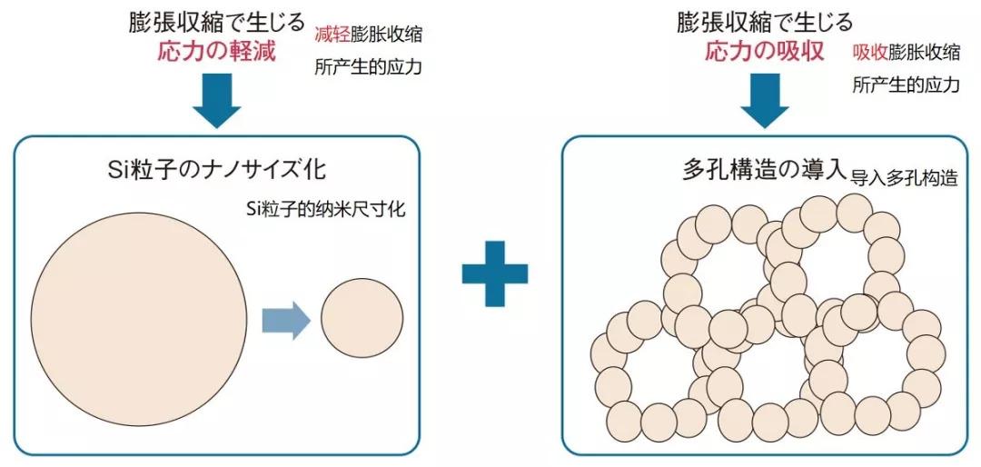 通過Si粒子的納米尺寸化以及導(dǎo)入多孔結(jié)構(gòu),緩和由于充放電的膨脹收縮導(dǎo)致的應(yīng)力變化。以上多孔結(jié)構(gòu)圖片是粗略圖像。