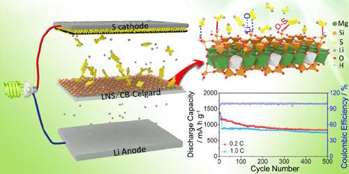 研究表明,該黏土礦物超親電解液隔膜對(duì)聚硫化物穿梭具有明顯的抑制作用,同時(shí)具有較高的Li+電導(dǎo)率、快速的Li+轉(zhuǎn)移、超親電解液性和較高的熱穩(wěn)定性。將其應(yīng)用于鋰硫電池時(shí),在循環(huán)穩(wěn)定性、倍率性能和抑制自放電等方面均表現(xiàn)優(yōu)異。聚硫化物穿梭抑制機(jī)理研究表明,聚硫化物與黏土礦物的O活性位點(diǎn)之間通過形成Li-S鍵和Li˙˙˙O鍵,從而使聚硫化物的穿梭得到有效抑制。相對(duì)于文獻(xiàn)報(bào)道,黏土礦物超親電解液鋰電池隔膜在鋰硫電池中具有明顯優(yōu)越性。此外,該隔膜具有較好的普適性,可通過簡(jiǎn)單的涂覆法制備,在LiFePO4和鋰硫電池中均表現(xiàn)出了優(yōu)異的性能。