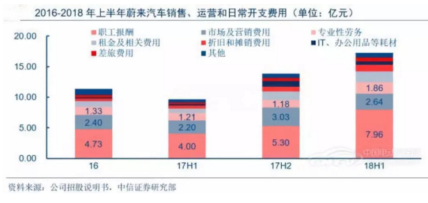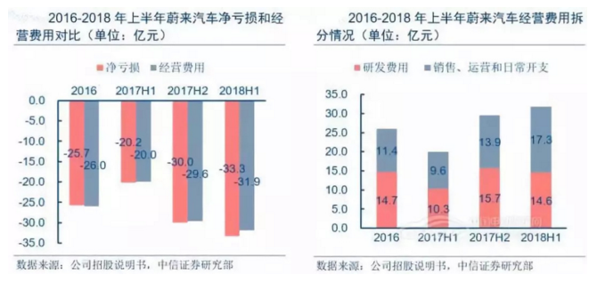 據此前蔚來招股書,從2016年至2018年6月30日的兩年半時間內,蔚來的總收入為4599萬元,而總營業(yè)費用達到了107.42億元,凈虧損109.2億元。其中,2016年、2017年、2018年上半年的支出分別為26.03億元、49.54億元、31.86億元;凈虧損分別為25.73億元、50.21億元、33.26億元。截至6月30日,蔚來的現金及現金等價物不足45億元。