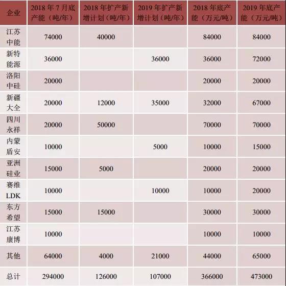 根據(jù)協(xié)會(huì)的統(tǒng)計(jì),2018年下半年國(guó)內(nèi)多晶硅產(chǎn)能增量在17.5萬(wàn)噸,到2018年底,國(guó)內(nèi)多晶硅產(chǎn)能可達(dá)43.9萬(wàn)噸。考慮到部分增量將暫緩或者終止,下半年實(shí)際新增量大約在12.6萬(wàn)噸,預(yù)計(jì)2018年底國(guó)內(nèi)多晶硅總產(chǎn)能在36.6萬(wàn)噸,同比凈增9萬(wàn)噸,預(yù)計(jì)到2019年底預(yù)計(jì)產(chǎn)能將達(dá)到47.3萬(wàn)噸。