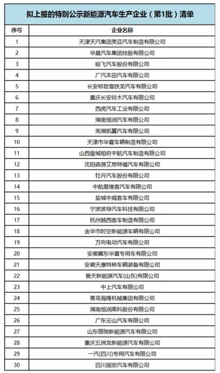 中國儲能網(wǎng)訊:9月3日,工業(yè)和信息化部裝備工業(yè)發(fā)展中心發(fā)布了一則“關(guān)于對擬上報《特別公示新能源汽車生產(chǎn)企業(yè)(第1批)》企業(yè)清單進行公示的通知”(以下簡稱《通知》),對于《公告》內(nèi)2017年7月1日前獲得新能源汽車生產(chǎn)資質(zhì)的企業(yè)進行了梳理,對停止生產(chǎn)新能源汽車產(chǎn)品12個月及以上的30家企業(yè)在9月3日-9月9日期間進行公示,如企業(yè)在公示期內(nèi)未將書面意見反饋,將上報至工業(yè)和信息化部。
