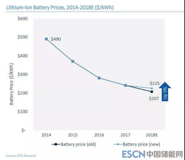 GTM Research預(yù)測(cè)2018年電池價(jià)格將再下跌14%,但價(jià)格下跌速度在上一季度顯著放緩。價(jià)格下跌速度的這種挫折并非僅僅是由于原材料價(jià)格上漲所致;相反,它來(lái)自市場(chǎng)上的電池短缺,特別是在用于電動(dòng)汽車(chē)和固定儲(chǔ)能的鎳錳鈷氧化物電池(NMC)的情況下。對(duì)這些NMC電池的需求超過(guò)供應(yīng),因?yàn)槟壳皼](méi)有足夠的電池制造工廠可以滿足不斷增長(zhǎng)的需求。然而,隨著未來(lái)兩年更大的生產(chǎn)能力上線,價(jià)格預(yù)計(jì)將進(jìn)一步下降。