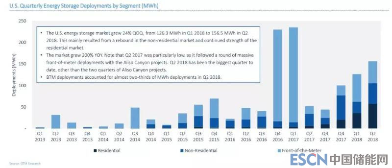 美國(guó)的儲(chǔ)能市場(chǎng)劃分為電表前和電表后,其中電表后又包括非戶用市場(chǎng)以及戶用市場(chǎng)。從2018年第二季度的數(shù)據(jù)來(lái)看,電表后儲(chǔ)能市場(chǎng)份額比重持續(xù)在提升。在2018年第二個(gè)季度,按功率計(jì),電表后儲(chǔ)能部署占據(jù)2018年第二季度儲(chǔ)能市場(chǎng)的75%,按容量計(jì),電表后儲(chǔ)能部署占據(jù)2018年第二季度儲(chǔ)能市場(chǎng)容量的近2/3。