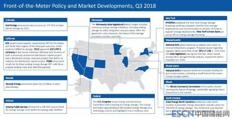 2018年第三季度,包括聯(lián)邦政府以及多個(gè)州均有儲(chǔ)能動(dòng)態(tài)發(fā)布。其中電表前儲(chǔ)能已經(jīng)受到美國(guó)聯(lián)邦政府肯定。美國(guó)國(guó)會(huì)眾議院能源和商務(wù)委員會(huì)舉行了關(guān)于儲(chǔ)能的聽(tīng)證會(huì)。在一項(xiàng)關(guān)于能源和水的撥款法案里,儲(chǔ)能被作為技術(shù)優(yōu)先事項(xiàng),以及重要的靈活性工具加以強(qiáng)調(diào)。