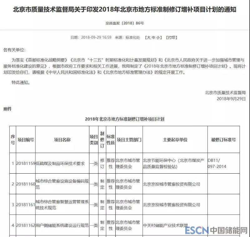 中國儲能網(wǎng)訊:2018年9月29日,北京市質量技術監(jiān)督局印發(fā)了《2018年北京市地方標準制修訂增補項目計劃》。其中,由中關村儲能產(chǎn)業(yè)技術聯(lián)盟申報的《用戶側儲能系統(tǒng)建設運行規(guī)范》項目獲批立項,為北京市一類制定推薦性標準項目。
