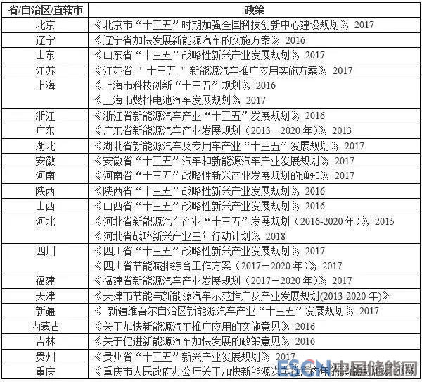 早在2001年,科技部發(fā)布的“國(guó)家“863”計(jì)劃重大專項(xiàng)”就將燃料電池汽車研究開(kāi)發(fā)列入其中;到了近些年,緊密出臺(tái)的《節(jié)能與新能源汽車產(chǎn)業(yè)發(fā)展規(guī)劃(2012—2020年)》、《中國(guó)制造2025》、《能源技術(shù)革命創(chuàng)新行動(dòng)計(jì)劃(2016-2030年)》、《國(guó)家創(chuàng)新驅(qū)動(dòng)發(fā)展戰(zhàn)略綱要》、《“十三五”國(guó)家戰(zhàn)略性新興產(chǎn)業(yè)發(fā)展規(guī)劃》以及《汽車產(chǎn)業(yè)中長(zhǎng)期發(fā)展規(guī)劃》等文件,均明確提及要重點(diǎn)研發(fā)氫能與燃料電池技術(shù),表現(xiàn)出中央政府對(duì)該新型能源技術(shù)的大力支持。此外,多個(gè)省/自治區(qū)/直轄市也積極布局燃料電池產(chǎn)業(yè),形成了巨大的引領(lǐng)效應(yīng)(統(tǒng)計(jì)如下表)。