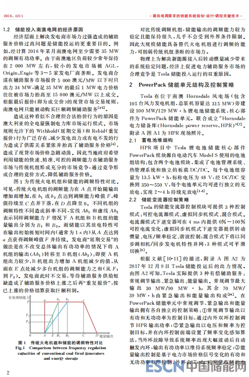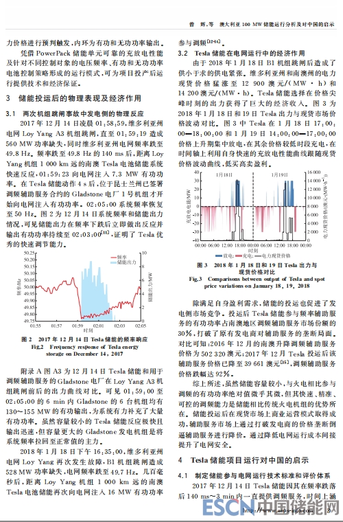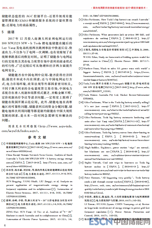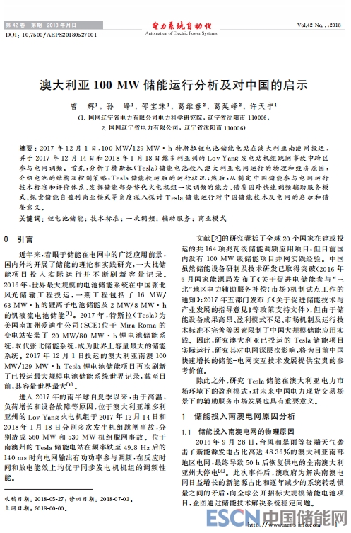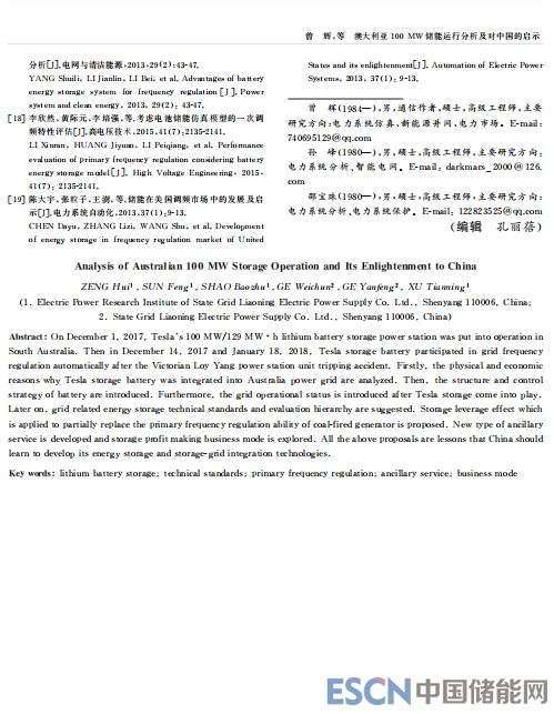 中國儲能網(wǎng)訊:2017年12月1日,100 MW/129 MW·h 特斯拉鋰電池儲能電站在澳大利亞南澳州投運,并于2017年12月14日和2018年1月18日維多利亞州的LoyYang發(fā)電站機組跳閘事故中跨區(qū)參與電網(wǎng)調(diào)頻。首先,分析了特斯拉(Tesla)儲能電池投入澳大利亞電網(wǎng)運行的物理和經(jīng)濟原因,介紹電池的結構及控制策略,Tesla儲能投運后的運行狀況;然后,從制定中國儲能參與電網(wǎng)運行技術標準和評價體系、發(fā)揮儲能部分替代火電機組一次調(diào)頻的能力、借鑒國外快速調(diào)頻輔助服務模式、探索儲能自盈利商業(yè)模式等角度深入探討Tesla儲能運行對中國儲能技術及電網(wǎng)的啟示和借鑒意義。