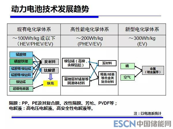 電池技術(shù)進(jìn)展,下圖是我們做“十二五”規(guī)劃時(shí)的圖,到現(xiàn)在為止沒有太大的變化,這是因?yàn)楝F(xiàn)有體系正極材料、負(fù)極材料有哪些都是確定的,只是不同正負(fù)極材料的搭配,能夠達(dá)到不同的性能指標(biāo)、能夠滿足不同車輛的使用。